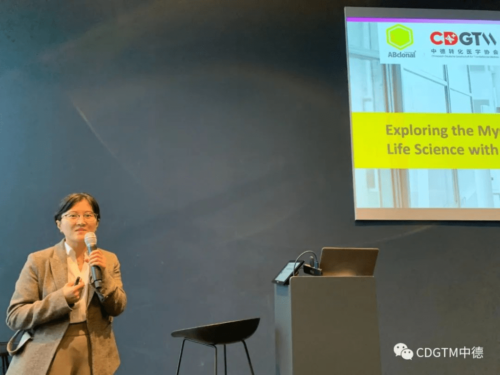 会议ABclonal(爱博泰克)德国区总负责人的陆婧博士向大家播放了ABclonal的宣传影片并做了Exploring the Mysteries of Life Science with You的演讲展示了ABclonal的历史、发展和万抗计划。ABclonal为生命科学研究提供高质量的抗体、蛋白、ELISA试剂盒、二代测序样品处理试剂盒和分子酶等科研工具,并提供体外诊断产品的早期开发和IVD原材料定制服务,客户遍布全球,包括Novartis, Genetek, BGI, Genomics, Novogene, 3DMed和Maxim等国际知名企业。
